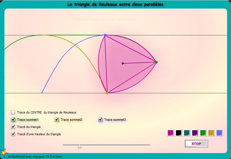 triangle de Reuleaux roule entre deux parallèles ET tourne dans